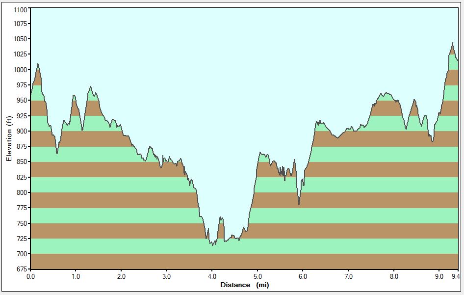 Here is a profile of the hike. Keep in mind there is only about 300 ft elevation change; the peaks weren’t nearly that ugly.