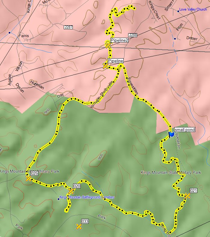 The south end of the Ridgeline Trail crosses two gas pipelines and the NC/SC State-line. The second pipeline crossing area was being worked on; plenty of grading equipment and red mud. The trail also uses a couple of other old dirt roads; the next video shows the crossing of the Yorkville/Shelbyville road (which I use as a return); the next runs mostly parallel with part of the national park boundary. This portion shows the mostly flat part of this trail.